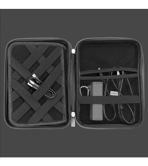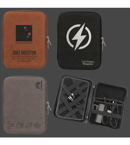 This Laserable Leatherette cord case is perfect for home, work, or travel. The hard case wrapped in the luxury of Laserable Leatherette has a double zip closure to keep cords, chargers, USB flash drives, power banks; all of your tech accessories secure in one place. The inside of the case has a center flap with straps on both sides to keep things tangle free. Both the topand bottom of the case have pockets and straps. Personalized it's a great gift for anyone!
