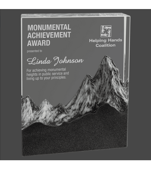 This premier optic crystal is handmade so sizes may vary slightly. The exquisite free-standing crystal piece features a dramatic resin 3D mountain scene with space to personalize above it on the clear crystal, or even below. This stunning crystal is appropriate for awarding people who have surpassed the peak of their careers, or add a special verse to create a touching tribute or memorial gift. The crystal is packaged in a lined gift box for added elegance.